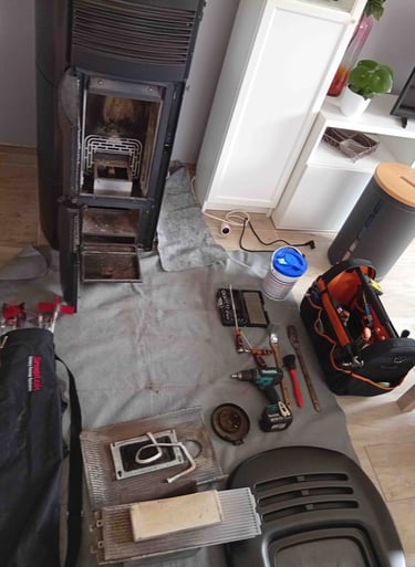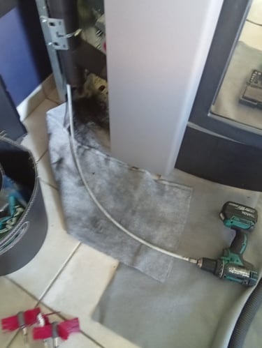 STËF-FLAM' est intervenu pour réaliser une opération complète d’entretien et de ramonage sur un poêle à granulés, conformément aux exigences du décret 2023-641.